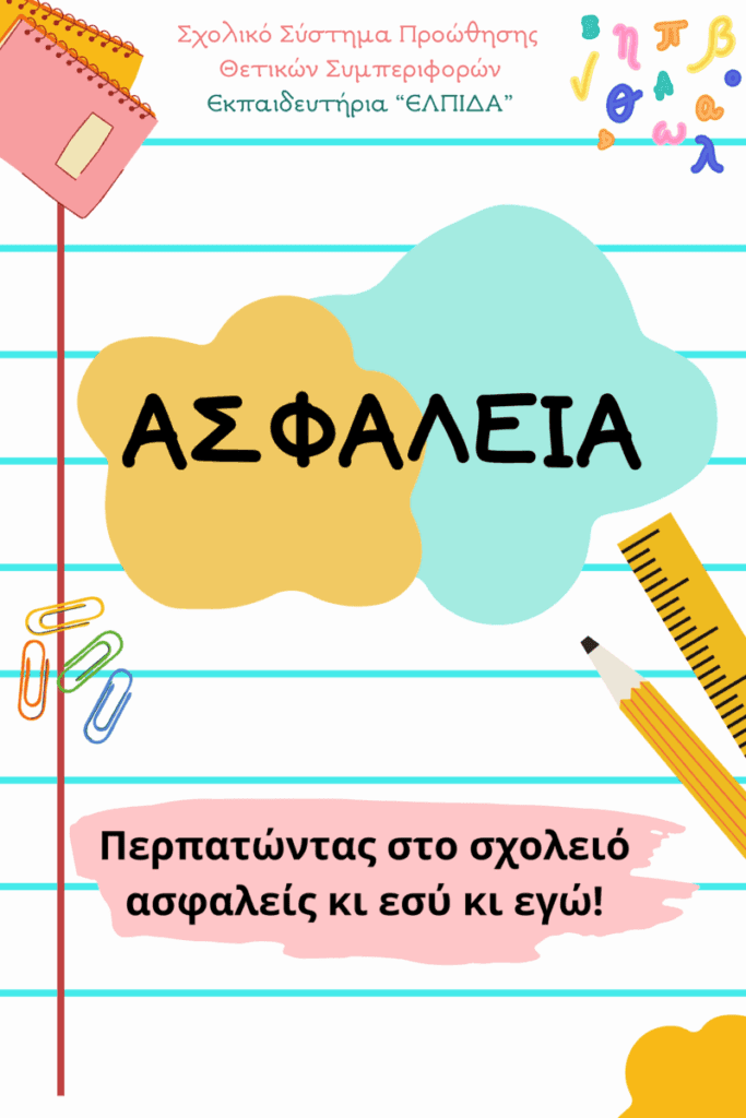 Οι παρακάτω αφίσες σχεδιάστηκαν από τα Εκπαιδευτήρια «ΕΛΠΙΔΑ» για το Σχολικό Σύστημα Προώθησης Θετικών Συμπεριφορών και συγκεκριμένα για την αξία της Ασφάλειας.