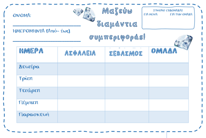 Παρακάτω μπορείτε να δείτε πίνακες επιβράβευσης για το Σύστημα Προώθησης Θετικών Συμπεριφορών. Άλλοι από αυτούς είναι αναρτημένοι στις σχολικές αίθουσες και άλλοι είναι ατομικά δελτία μαθητών. Στόχος είναι με τον τρόπο αυτό οι μαθητές να οδηγηθούν σταδιακά στην κατάκτηση των δεξιοτήτων της υπευθυνότητας και της ασφάλειας.